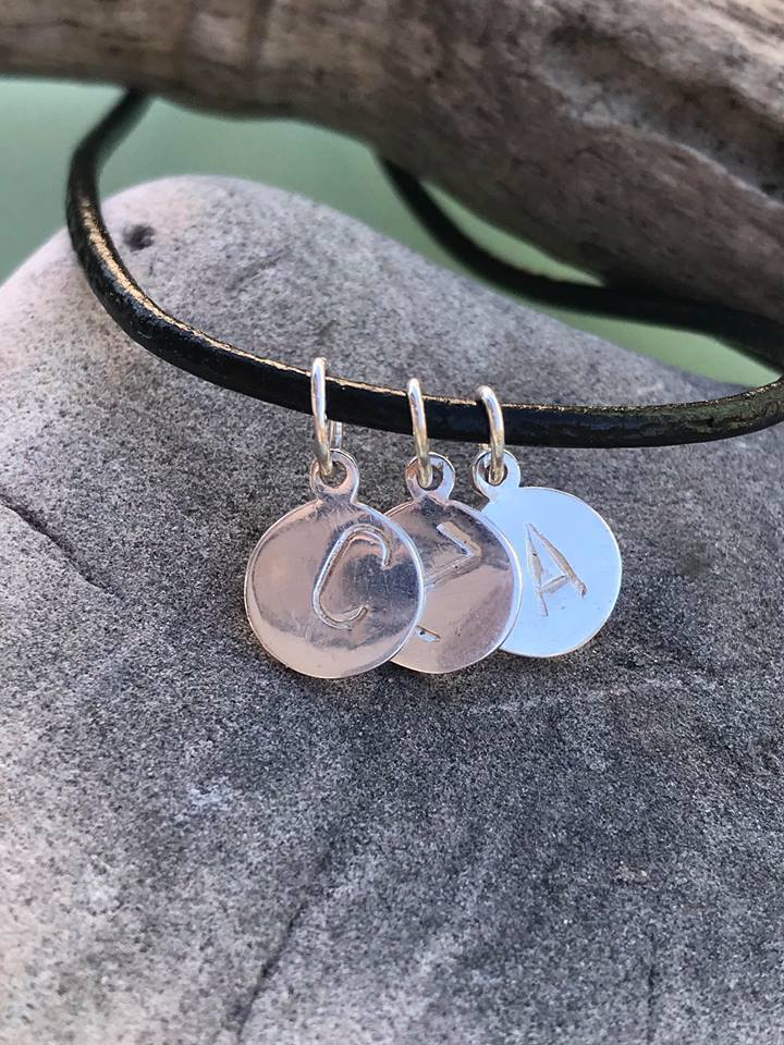 Simple unisex design featuring a solid sterling silver round tag hand stamped with an initial of your choice, on leather.